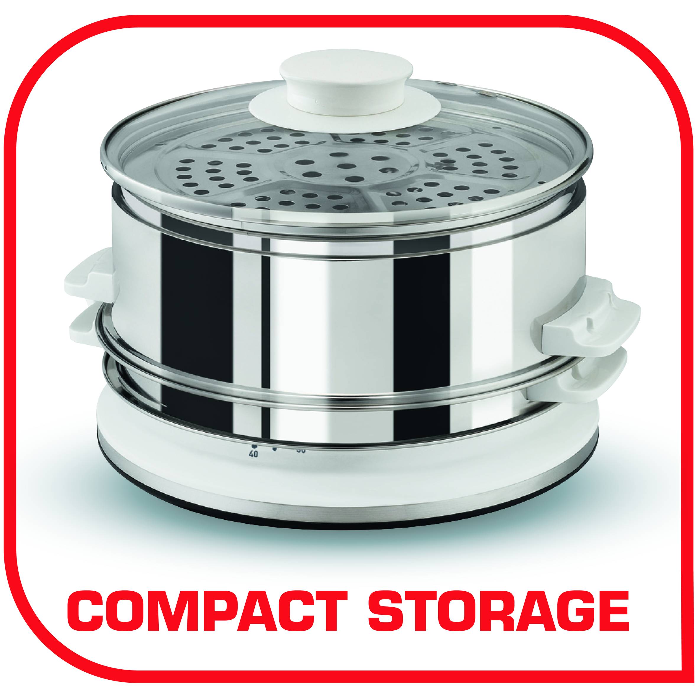 Tento parný hrniec s dvomi nádobami sa ľahko skladuje, pretože nádoby je možné usporiadať hore dnom na základňu a zabezpečiť tak kompaktnú veľkosť. Časovač s automatickým vypnutím poskytuje jednoduché používanie. Do parného hrnca možno počas varenia kedykoľvek ľahko dopĺňať vodu, hladina vody je navyše vždy vidieť. 60-minútový mechanický časovač so zvukovým upozornením signalizuje, keď je jedlo hotové. Viditeľný ukazovateľ hladiny vody, 2 stohovateľné nádoby, objem 6 litrov.