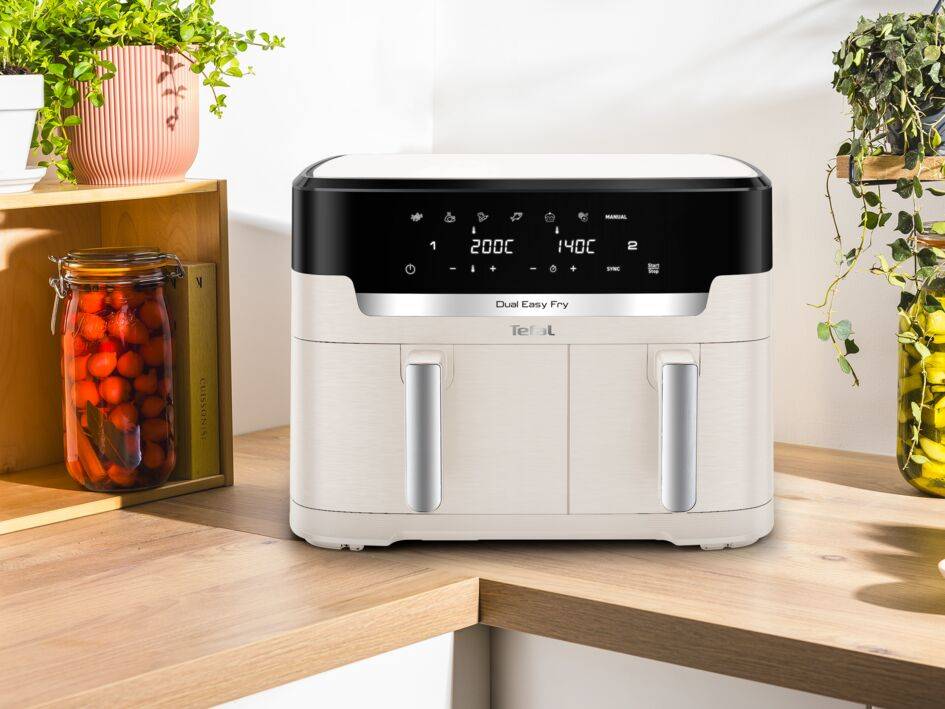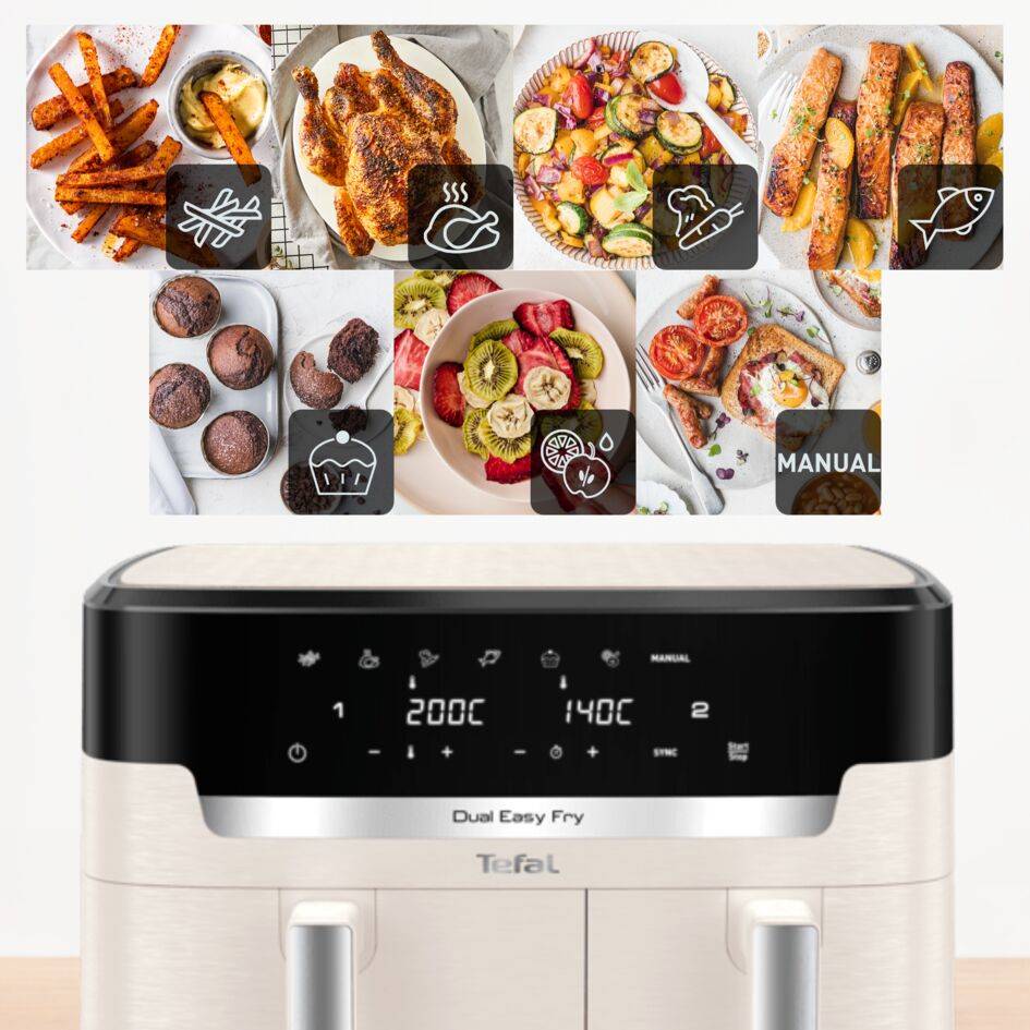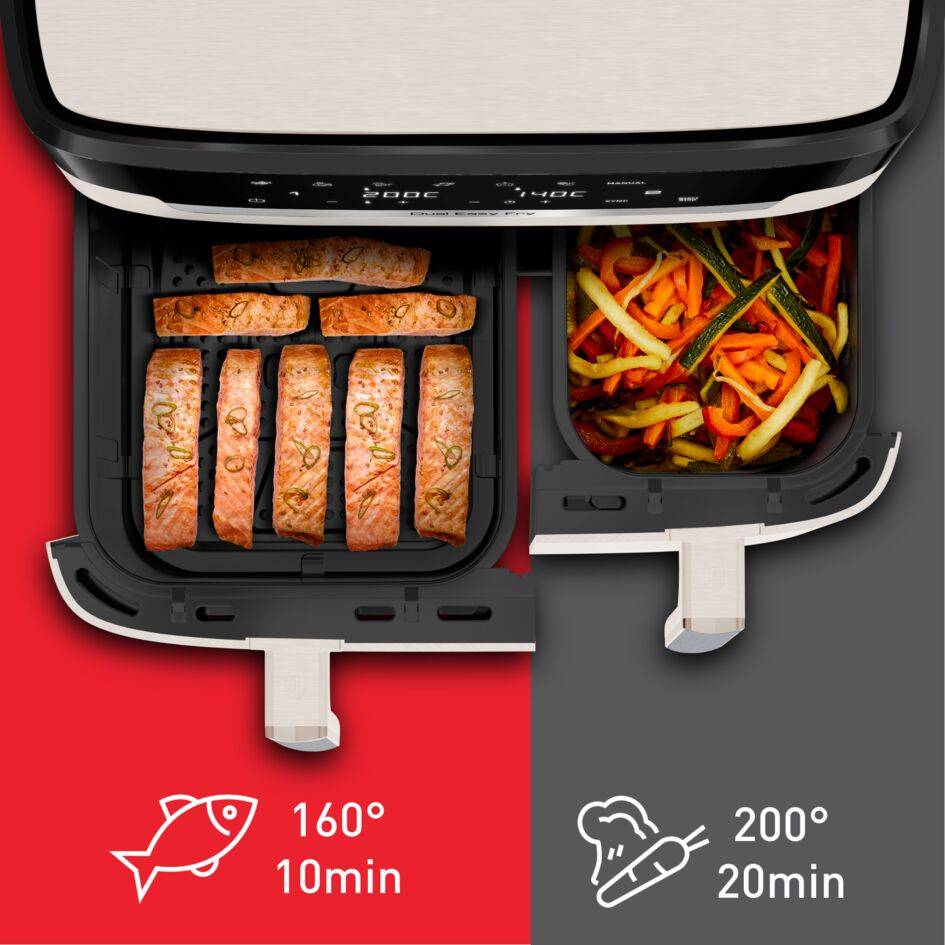 Dvojitá teplovzdušná fritéza s mimoriadne veľkým objemom na prípravu dvoch rôznych jedál – kompletné jedlo pripravené raz-dva Najväčšia teplovzdušná dvojitá fritéza Tefal: Extra veľký objem so 6,5 l nádobou a 4,5 l nádobou – ideálne pre 8 až 10 osôb. 7 prednastavených programov: Hranolky, kuracie mäso, zelenina, ryby, dezerty, sušenie a manuálne nstavenie teploty (40 – 200 °C) Jednoduchá príprava rôznych vyvážených jedál, od chrumkavých hranolčekov po lahodného lososa, ktoré si každý zamiluje Spotrebuje až o 70 % menej energie a pripraví pokrmy až o 45 % rýchlejšie ako klasické rúry (testy vykonané v roku 2024 na mrazených hranolčekoch) Nádoba na fritovanie s nepriľnavým povrchom vhodná do umývačky riadu umožňuje jednoduché čistenie a bezstarostné varenie Bezplatná mobilná aplikácia My Tefal, vďaka ktorej máte na dosah ruky recepty prispôsobené vašim chutiam, času alebo surovinám, a ďalšie informácie 15-ročná opraviteľnosť pomáha chrániť životné prostredie a znižuje množstvo odpadu