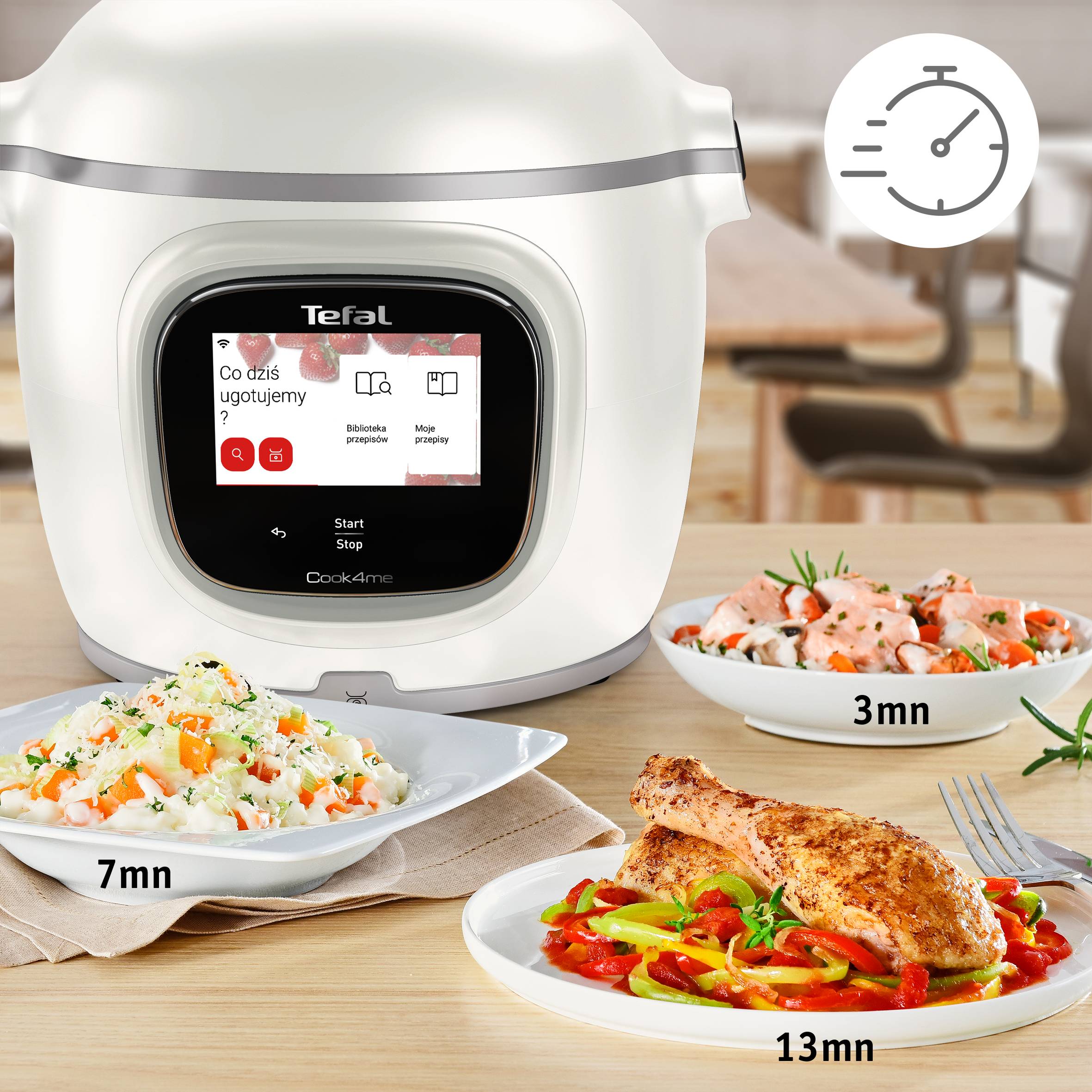 Zdravé a chutná jedlá raz-dva na vašom stole – vďaka nášmu najrýchlejšiemu a najinteligentnejšiemu multifunkčnému hrncu Môžete zabudnúť na odmerky. Náš spotrebič je vybavený mimoriadne presnou integrovanou váhou, ktorá počas varenia ľahko odváži ingrediencie priamo v nádobe Neobmedzený prístup k bezplatným receptom vďaka WiFi pripojeniu v aplikácii Tefal je zárukou každodenného pestrého stravovania Recepty odporúčané na základe vašej chuti, predchádzajúceho varenia a ingrediencií, ktoré máte doma Perfektné výsledky a jednoduchá príprava vďaka podrobným pokynom v podobe fotografií a videí, ktoré sa zobrazujú na veľkom dotykovom displeji Šetrí čas aj energiu: Vysokotlaková technológia umožňuje variť až 6-krát rýchlejšie* a ušetrí až 80 % energie Prenechajte varenie multifunkčnému hrncu Cook4me a nemusíte už na nič dohliadať Kvalita podporená našou 15-ročnou zárukou opraviteľnosti, ktorú poskytujeme v záujme ochrany životného prostredia a znižovania množstva odpadu