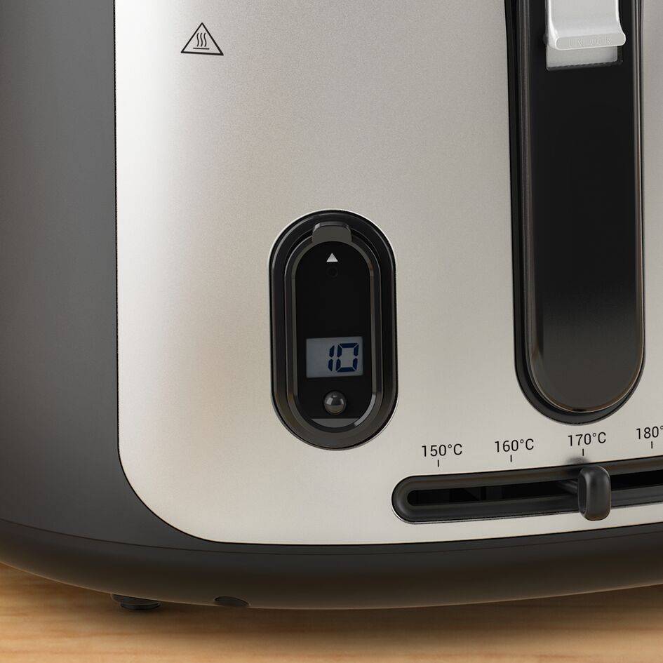 Olejová fritéza s exkluzívnym vekom využívajúcim technológiu Grandview v záujme lepšieho prehľadu a dokonalých výsledkov Filtračné sito pre čistejší olej s dlhšou trvanlivosťou a lepšou chuťou jedla Odpojiteľný, prenosný časovač si môžete vziať vo vrecku kamkoľvek v dome –tomu sa hovorí jednoduchý dohľad nad varením Moderný, elegantný dizajn s kovovými dielmi dodá každej kuchyni elegantný nádych Veľkorysý objem 1,2 kg, ktorý je ideálny pre celú rodinu – až pre 4 osoby Kompaktný dizajn a skladacia rukoväť uľahčujú uloženie v akejkoľvek kuchyni Odpojiteľné súčasti vrátane nezávislého filtračného sita, koša a odpojiteľného veka sú zárukou jednoduchého čistenia Ovládací panel, ktorý sa ľahko naučíte ovládať, s časovačom, reguláciou teploty, vypínačom a automatickým otváraním veka
