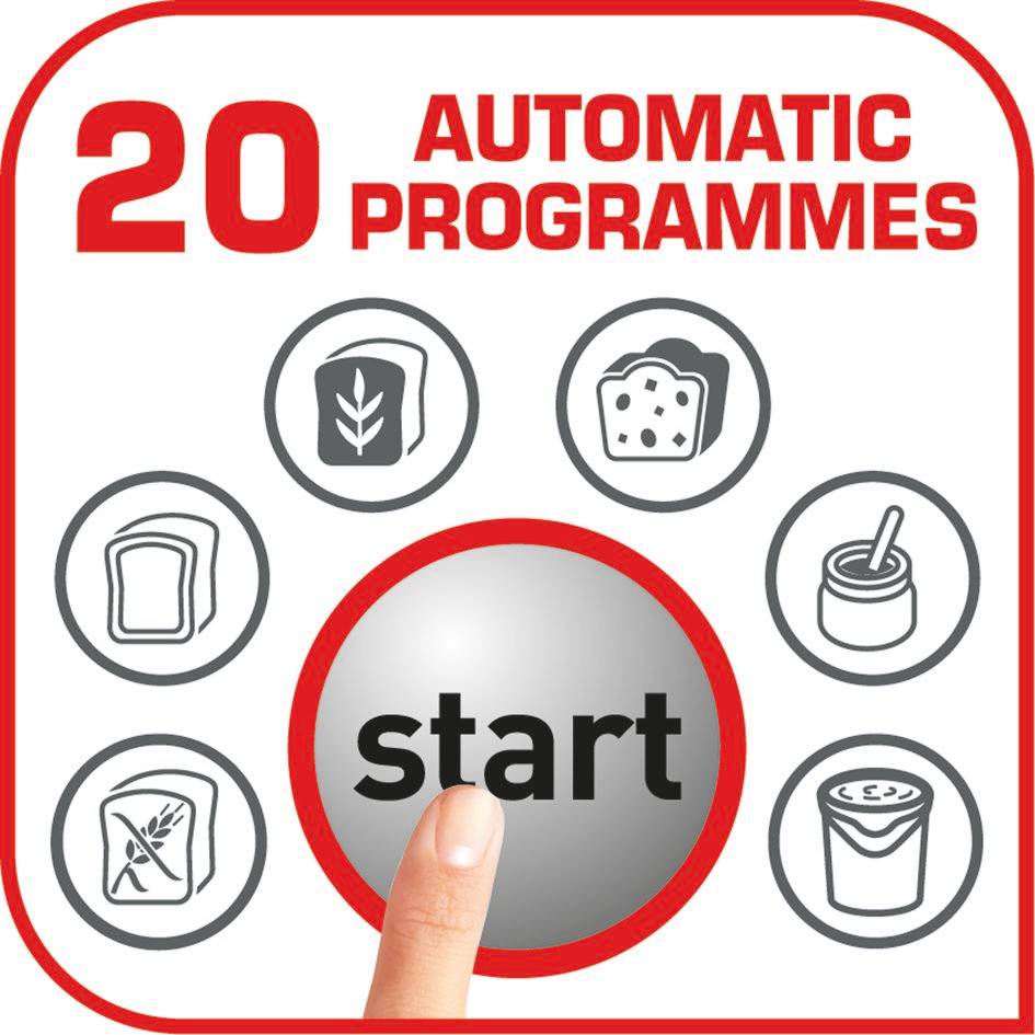 Domáca pekáreň ponúka 20 rôznych programov vrátane možnosti prípravy bezlepkových variantov, 3 špeciálne programy na prípravu mliečnych výrobkov s nádobou na jogurt s objemom 1 L. Vďaka 15-hodinovému časovaču si môžete vychutnať čerstvo upečené a teplé pečivo presne vtedy, keď vám to najviac vyhovuje.