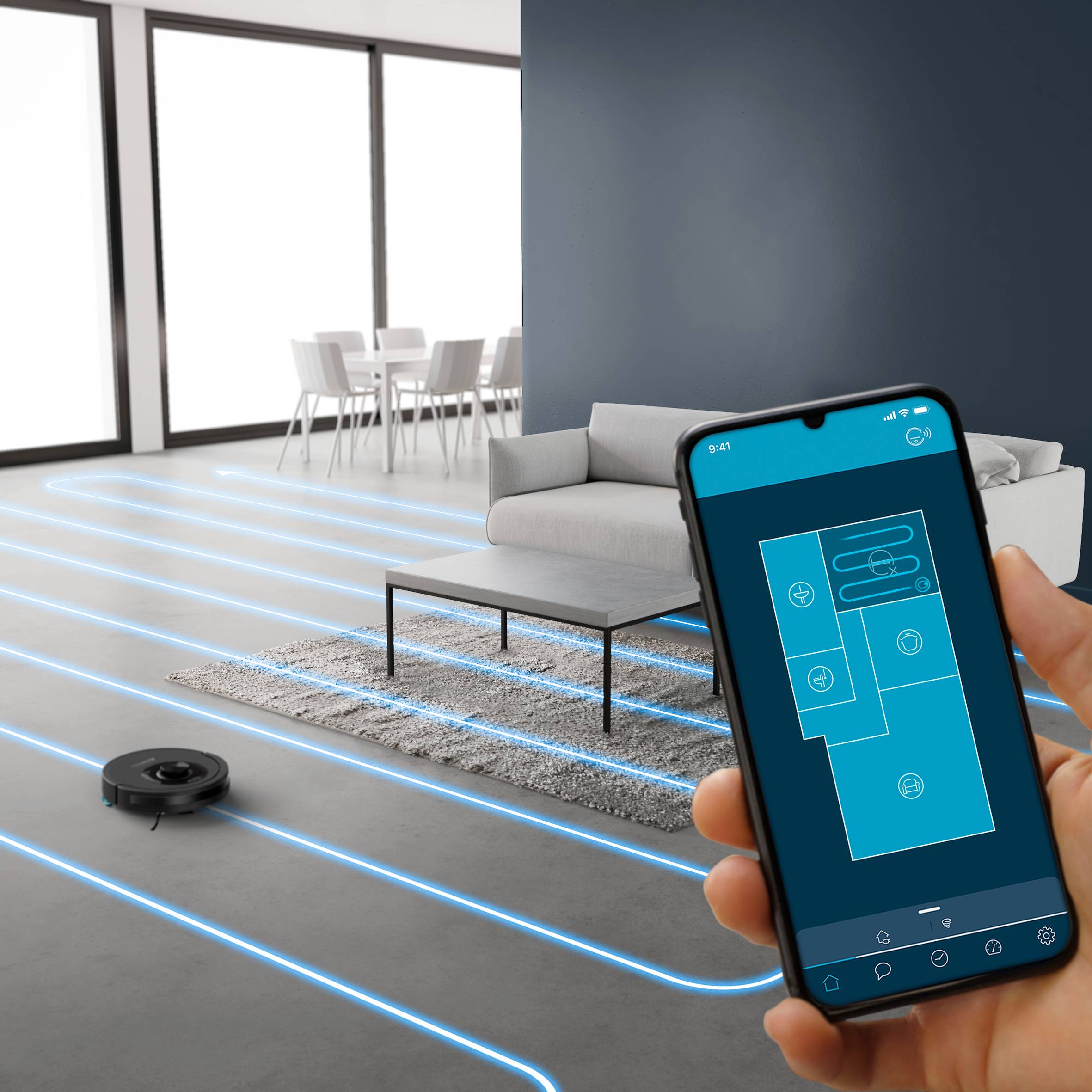 Hĺbkové čistenie vďaka vysokému saciemu výkonu až 6000 Pa Vychutnajte si až 60 dní bez vysypávania prachovej nádoby vďaka automatickej stanici s mimoriadne veľkým objemom prachového vrecka a vysokým stupňom filtrácie prachu Inteligentná navigácia s 360° laserovou detekčnou technológiou ponúka presné čistenie, kompletné pokrytie miestnosti a stálu mapu Presné utieranie pomocou technológie Smart Aqua Power: Systém elektronickej nádržky na vodu umožňuje regulovať objem vody pre každú miestnosť zvlášť Vysáva a utiera súčasne: Vysávajte a utierajte zároveň vďaka kefám na zachytávanie neporiadku všetkých veľkostí a technológii Smart Aqua Power Nepretržité automatické upratovanie: Robot sa vráti do dokovacej stanice, aby sa dobil, a potom pokračuje v upratovaní tam, kde skončil Upratovanie aj skutočne veľkých domácností: Na jedno nabitie robot vyčistí až 270 m2 za 270 minút a potom sa automaticky vráti do svojej stanice, aby sa dobil Upratovanie na mieru: Mobilná aplikácia umožňuje spravovať mapy, plánovať, kde a kedy sa má upratovať, a ďalšie funkcie